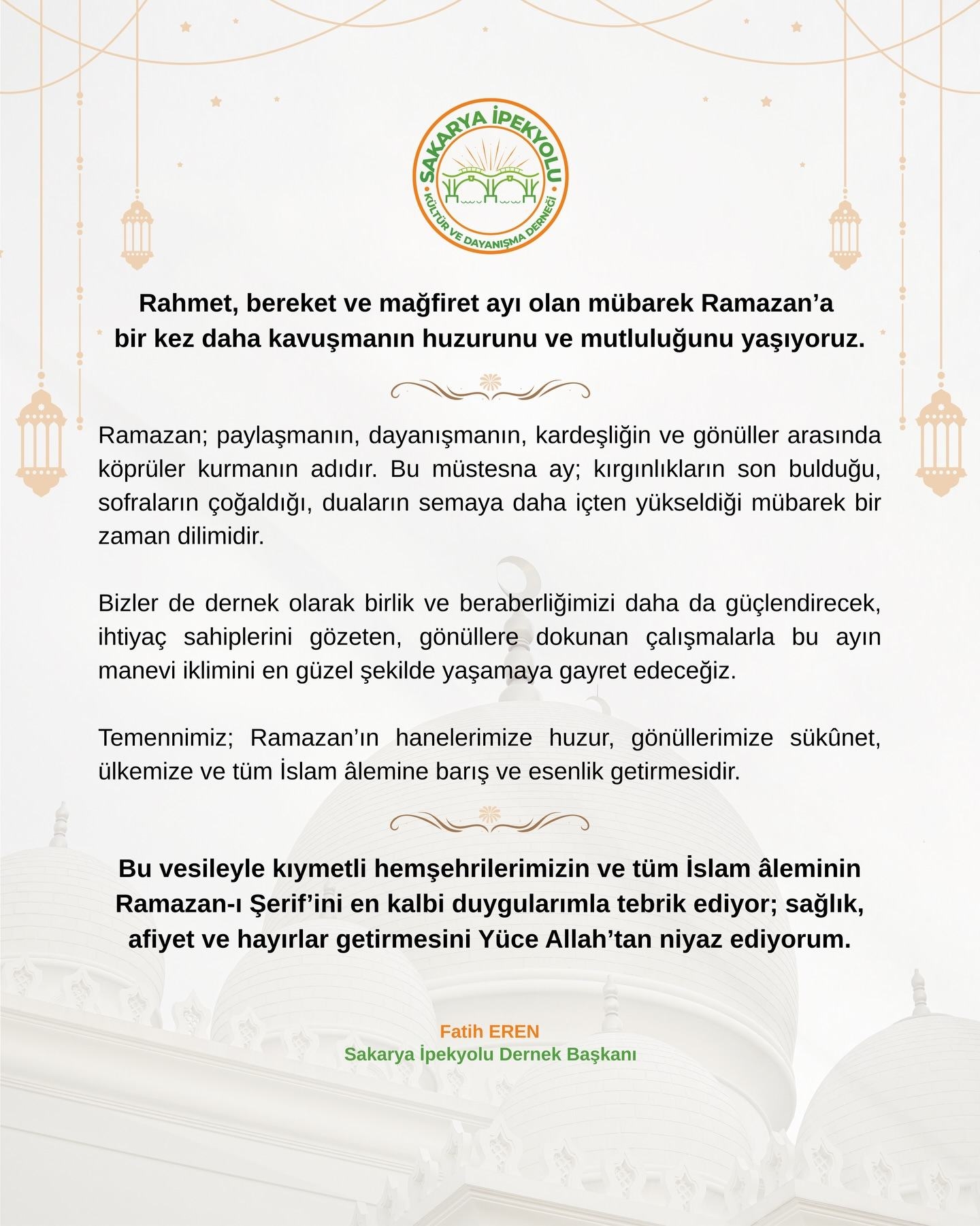 Bizler de dernek olarak birlik ve beraberliğimizi daha da güçlendirecek, ihtiyaç sahiplerini gözeten, gönüllere dokunan çalışmalarla bu ayın manevi iklimini en güzel şekilde yaşamaya gayret edeceğiz.
